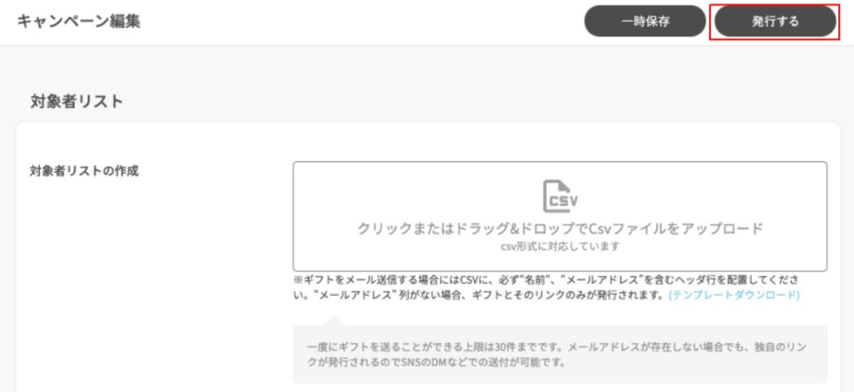 ギフトチケットを送付したいお客様の名前・メールアドレスのリストがあれば、CSVでアップロード可能です。メインビジュアルとキャンペーン名を設定することですぐにギフトチケットを発行することができます。